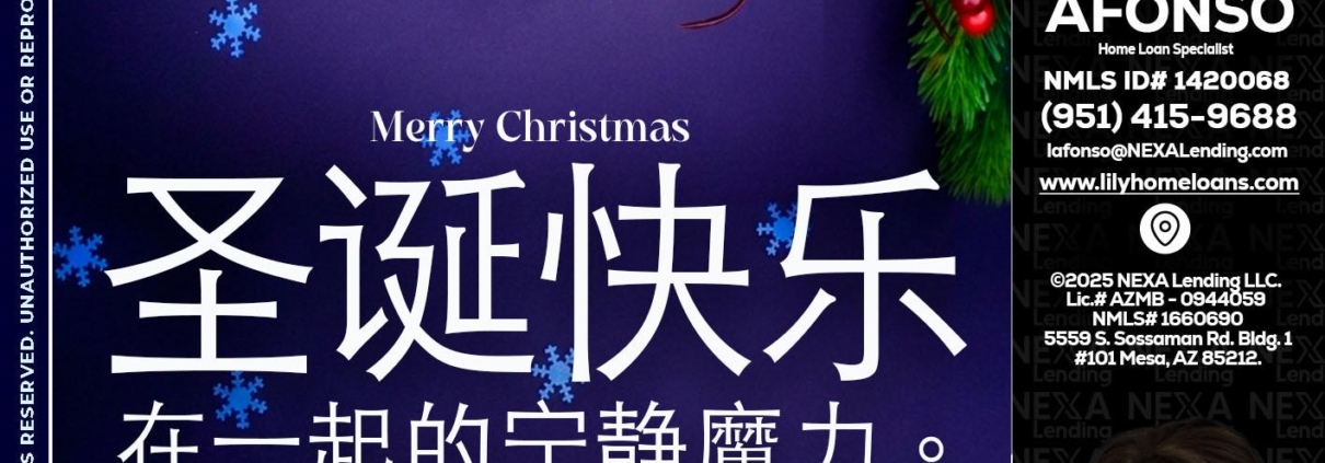 圣诞快乐 在一起的宁静魔力。 - Liliana Afonso -Home Loan SpecialistHi, my name is Liliana Afonso. I’m a Loan Officer with NEXA Lending LLC., offering personalized mortgage solutions, fast customized quotes, great rates and service with integrity.