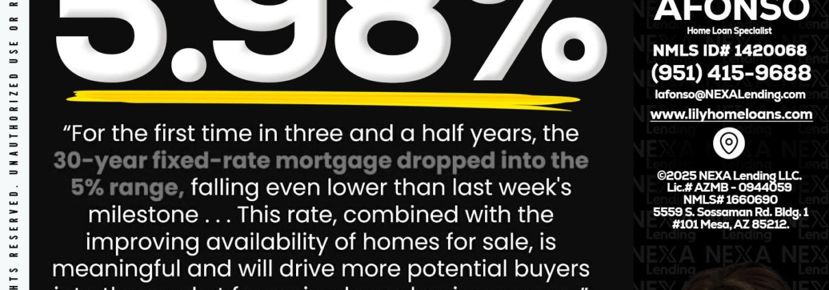 5.98% - Liliana Afonso -Home Loan SpecialistHi, my name is Liliana Afonso. I’m a Loan Officer with NEXA Lending LLC., offering personalized mortgage solutions, fast customized quotes, great rates and service with integrity.