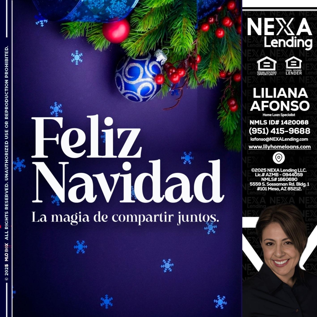 FELIZ NAVIDAD - Liliana Afonso -Home Loan SpecialistHi, my name is Liliana Afonso. I’m a Loan Officer with NEXA Lending LLC., offering personalized mortgage solutions, fast customized quotes, great rates and service with integrity.