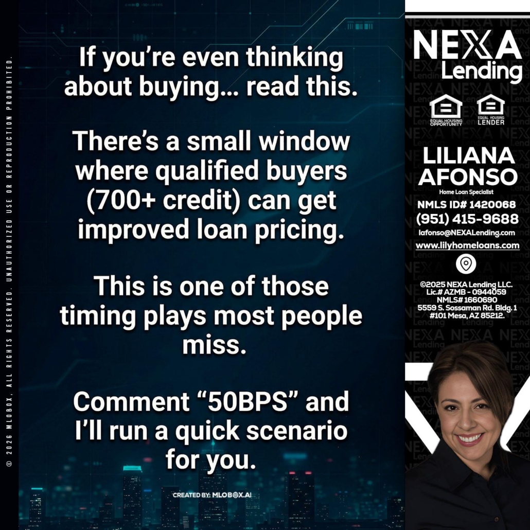Hi, my name is Liliana Afonso. I’m a Loan Officer with NEXA Lending LLC., offering personalized mortgage solutions, fast customized quotes, great rates and service with integrity.