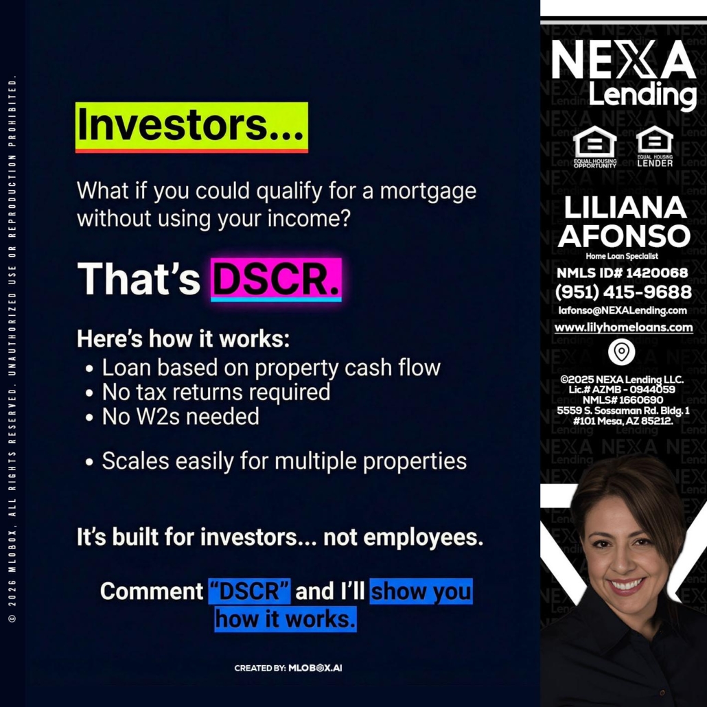 INVESTORS - Liliana Afonso -Home Loan SpecialistHi, my name is Liliana Afonso. I’m a Loan Officer with NEXA Lending LLC., offering personalized mortgage solutions, fast customized quotes, great rates and service with integrity.