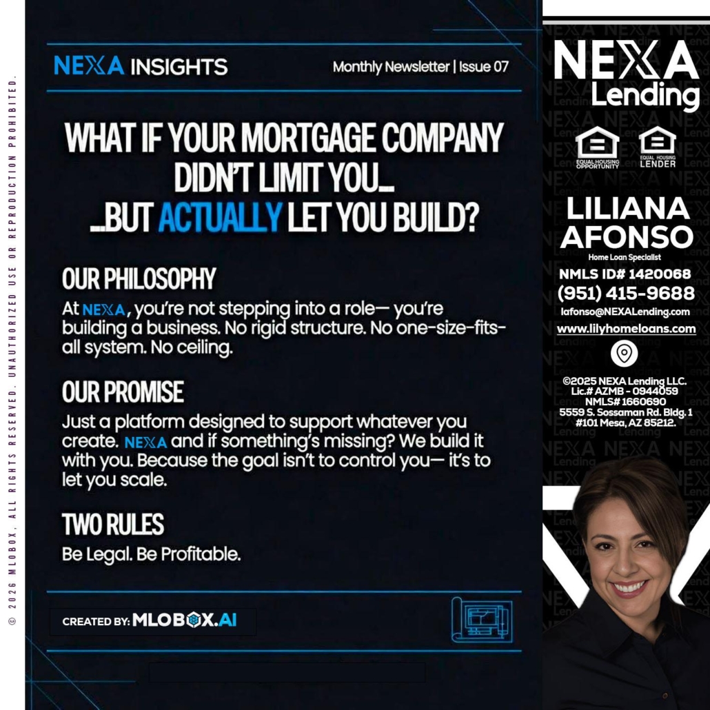 NEXA INSIGHTS - Liliana Afonso -Home Loan SpecialistHi, my name is Liliana Afonso. I’m a Loan Officer with NEXA Lending LLC., offering personalized mortgage solutions, fast customized quotes, great rates and service with integrity.
