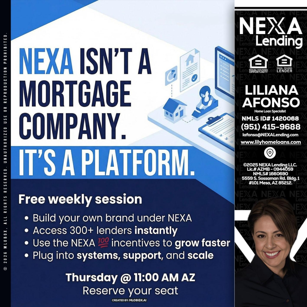 Hi, my name is Liliana Afonso. I’m a Loan Officer with NEXA Lending LLC., offering personalized mortgage solutions, fast customized quotes, great rates and service with integrity.