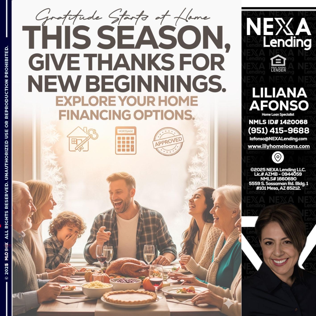 Hi, my name is Liliana Afonso. I’m a Loan Officer with NEXA Mortgage LLC., offering personalized mortgage solutions, fast customized quotes, great rates and service with integrity.